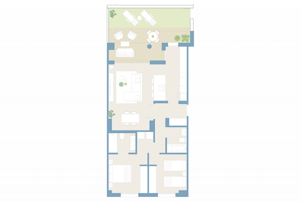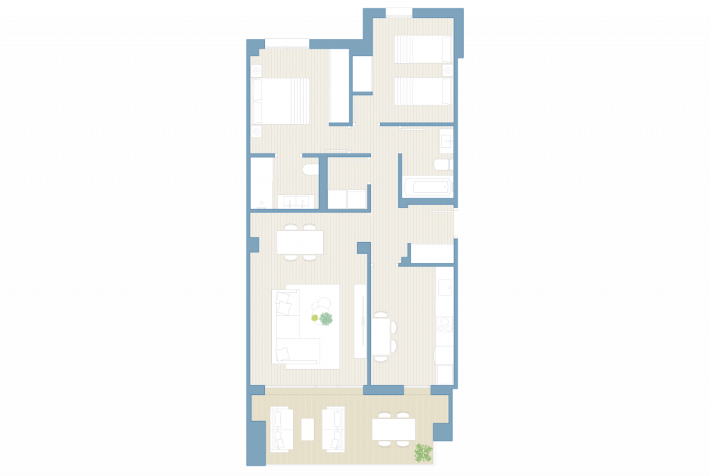 El conjunto residencial se compone de un edificio de diferentes alturas: baja +3 y baja +4, que ofrece viviendas amplias y luminosas, acompañadas de una piscina rodeada de zonas verdes, gimnasio, sala social y un espacio destinado al ocio con mesas y pérgola al aire libre. La construcción también cuenta con garajes y trasteros.